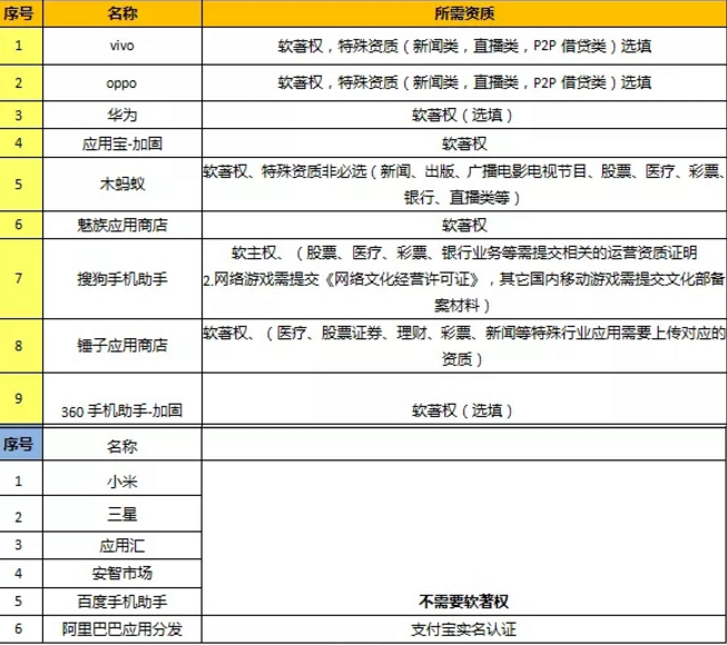 附各个应用市场App上架所需资质: